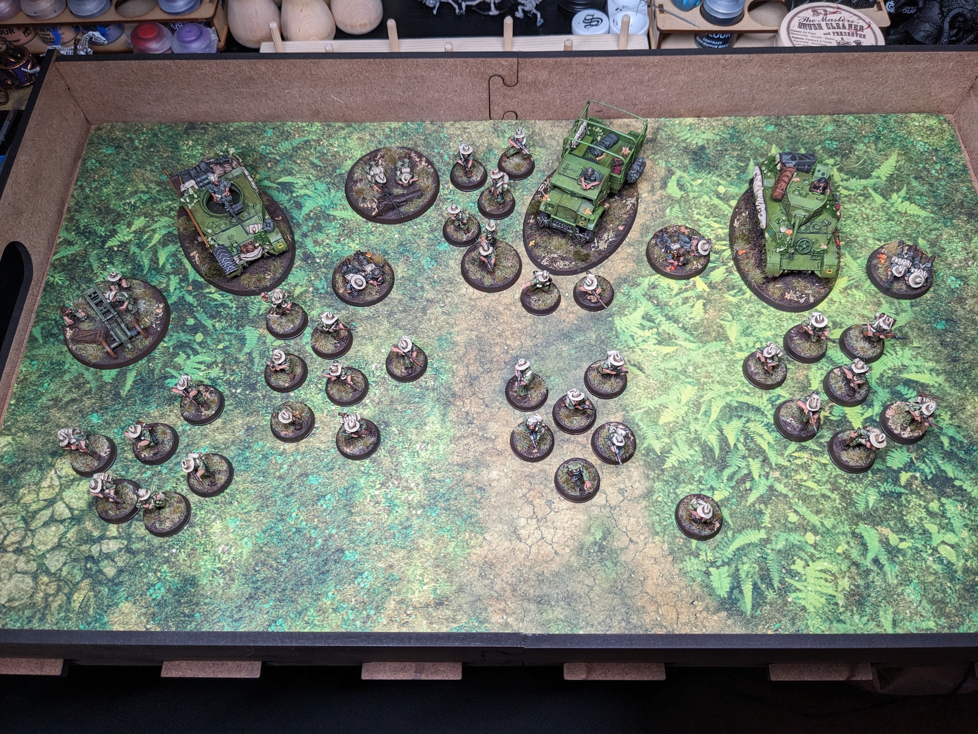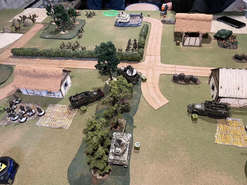Ben – As discussed in the intro, we were working with 450pts in a Combat Patrol for Game 1, and then Games 2 and 3 allowed Theater Selectors at 800pts and 1100pts respectively. I was running an expanded version of my Battle of the Bulge Americans from Operation Sting 2018 and Armored Apocalypse 2023, adding more infantry and a trio of halftracks to the collection.