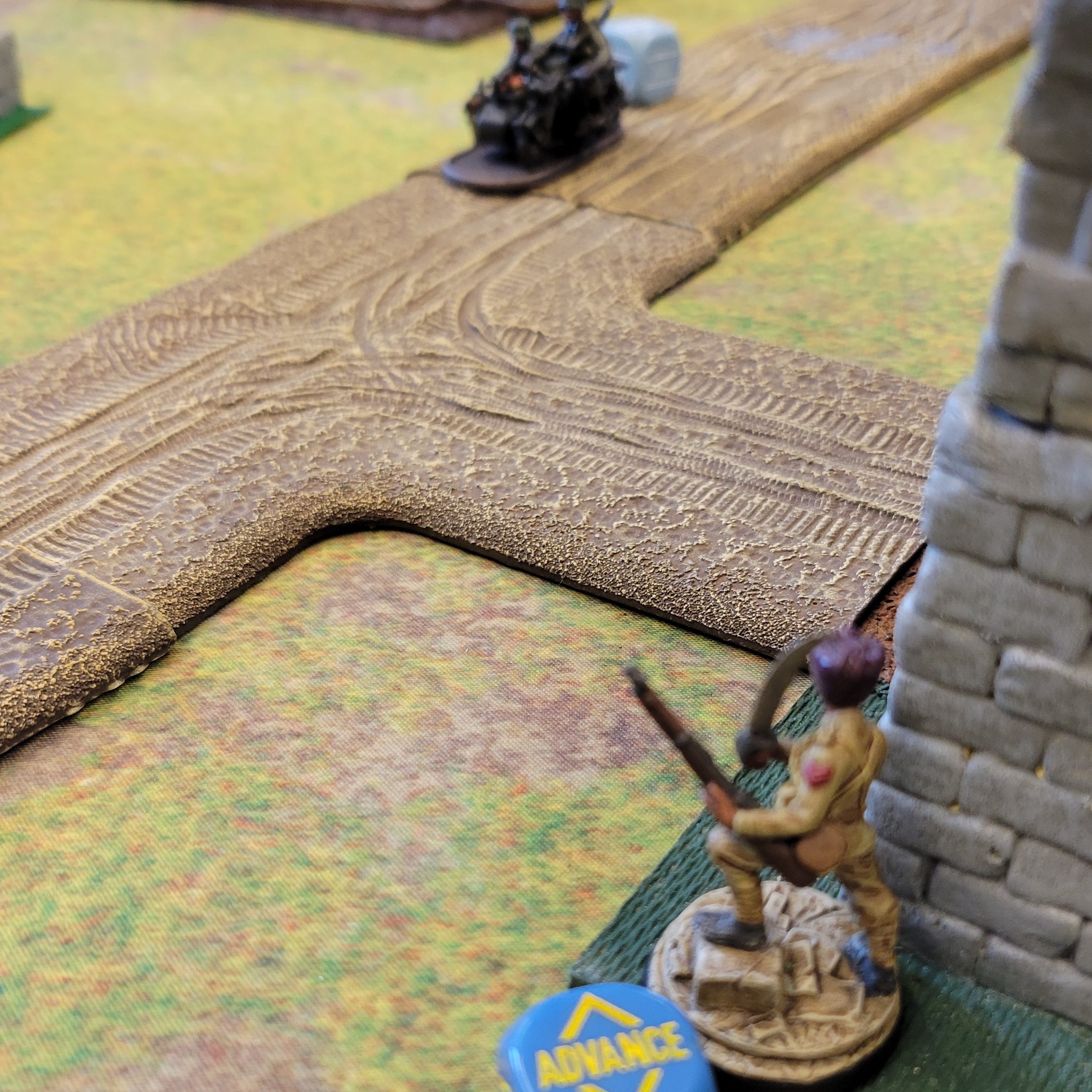 John – While I originally planned to bring a Vichy French or Hungarian force for this event, insufficient hobby time meant those projects were put on hold and I fell back to my old reliable North Africa British/Indians. My 8-Order Dice army consisted of an Inexperienced Second Lt, three squads of six Regular riflemen, a Sniper Team, the valuable, versatile, and venerable 25-pdr, a motorcycle with LMG sidecar, and a Vickers Light Tank Mk VI C armed with a Light Autocannon and co-axial MMG. This list is similar to other Combat Patrol lists I’ve run in the past so I felt comfortable that I’d be able to get the most out of my units.