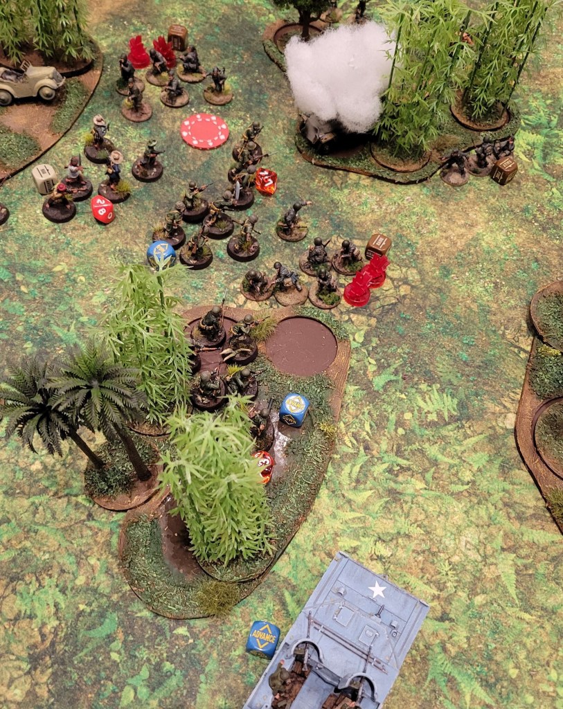 Our first game was a thematic matchup against Mike & Joe’s double-IJA force on a jungle table. What a way to start the event! There is something cinematic about two fully painted historical opposing forces meeting on a table of thematic terrain. Just from a visual standpoint alone, this game was already a winner. Mike & Joe’s double-IJA force included several massive 15-man Vet Rifle Squads supported by an Artillery Platoon with a Med. AT Gun and two Light Howitzers. Backing all those infantry was an Armored Platoon of three Type 95 Ha-Go led by the mighty Type 3 Chi-Nu. Our AT assets were looking thin indeed.