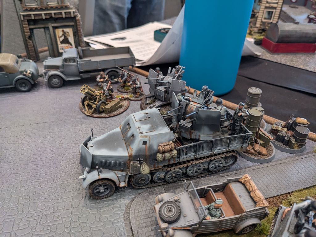 In our next game, we faced off against an absolutely gorgeous Early War German force painted by Mike & Mike. No joke – one of the best painted Bolt Action armies I’ve ever seen. I should have taken more photos. Mike & Mike had a variety of Early War Blitzkreig vehicles and infantry, including a Kradshutzen Squad and a core of FJs. There was also a quad-flak half-track as well as a quad-flack artillery piece with a Nebelwerfer for some extra punch.