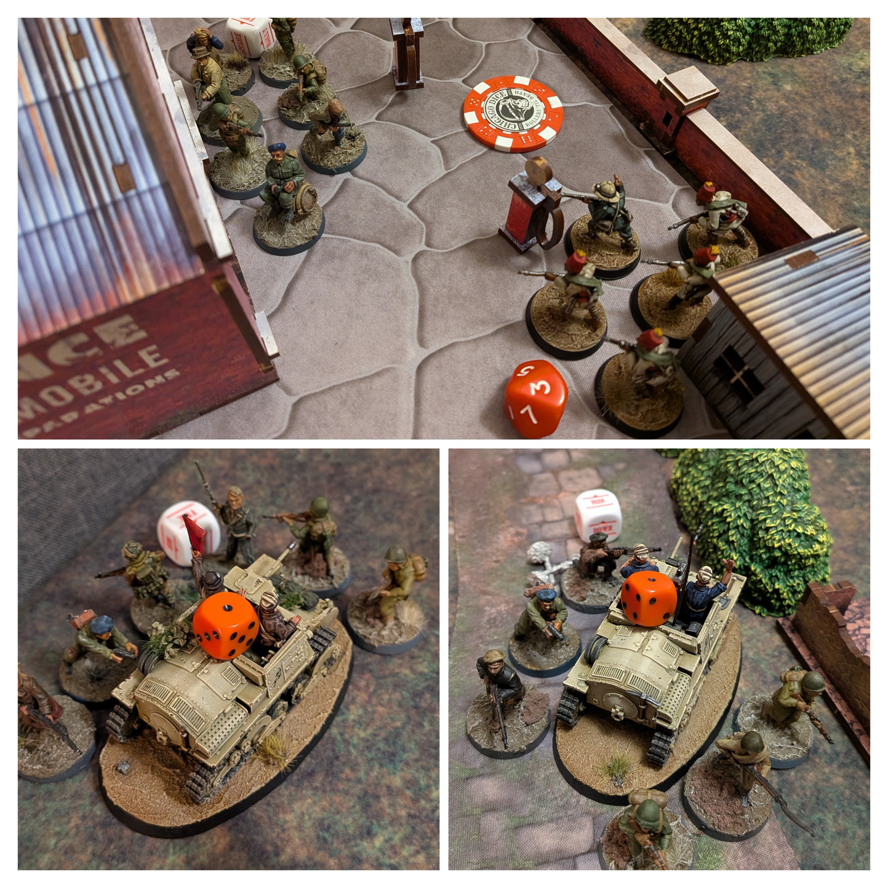 Those Vichy French are hiding something. Sneak some men under the cover of darkness and find out what it is. With their orders in hand, the Germans launched three infantry squads. One squad down each flank, and the third took cover in a central building. Almost immediately, flares went up. This was not going to be easy. Three FT-17s were mobilized to deal with the German forces. The central infantry squad came under heavy fire from a Sniper, ATR, an AT FT-17, and infantry squads, but they pushed forward into another building. Then, one of the Vichy infantry squads closed in on them for a shootout. The German Grenadiers suffered a casualty before firing back. The German infantry squad from the right flank pushed forward and finished off the attacking Vichy French infantry squad. Meanwhile, the left flank Grenadiers closed in for a point-blank shootout with another group of Vichy infantry and their Commander. Heavy casualties were suffered by both sides before the German Commander followed up to assist, allowing the lone German infantryman to run past, protected by a copse of trees. The German Light Mortar Team kept an FT-17 busy on the right flank before running past the enemy to infiltrate their base of operations. In the center, the German Grenadiers and Sniper Team continued to be the focus of the Vichy French’s fire. They were pinned down and took a while to regroup. Seeing this opening, the Vichy French AT Rifle Team ran past the German line. Finally, the German sniper team, threw caution to the wind and ran to meet the other German squads that had pushed on to the objective. The final tally was 12-3 with three Vichy French units neutralized, three German squads infiltrating the opponent’s operations, and one Vichy French squad fighting past the German line. It was a fun game. – Logan