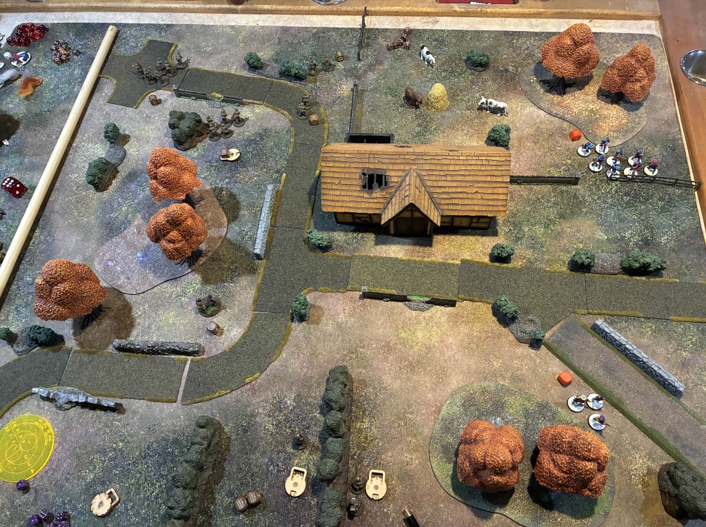 Turn 5 saw Russian Veterans launch a more effective assault from the ruined farmhouse. Three grenades hit home, destroying the M8. Meanwhile, the Command T-60 closed to point-blank range on the M15 and scored two hits – but rolled snake eyes for damage. The M15 hastily withdrew. Sporadic gunfire followed, with both sides taking light casualties. Rob now led with 2 Order Dice to 1.