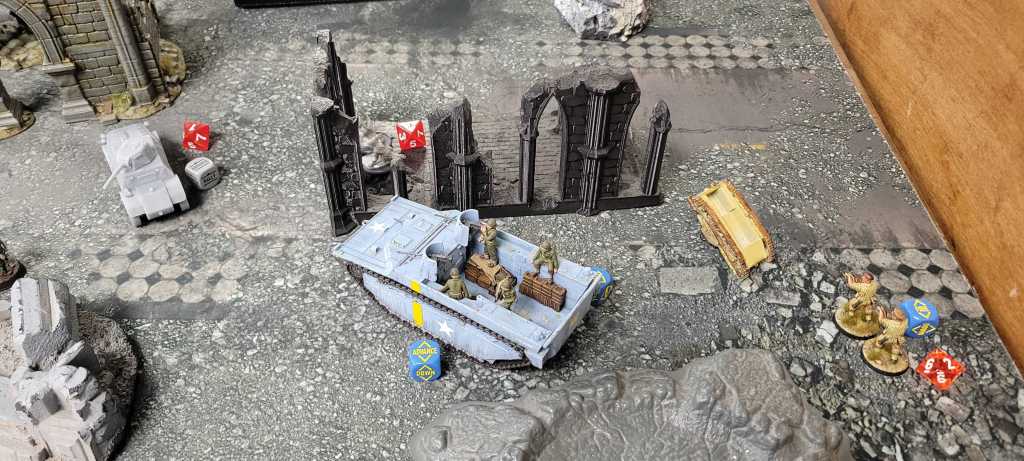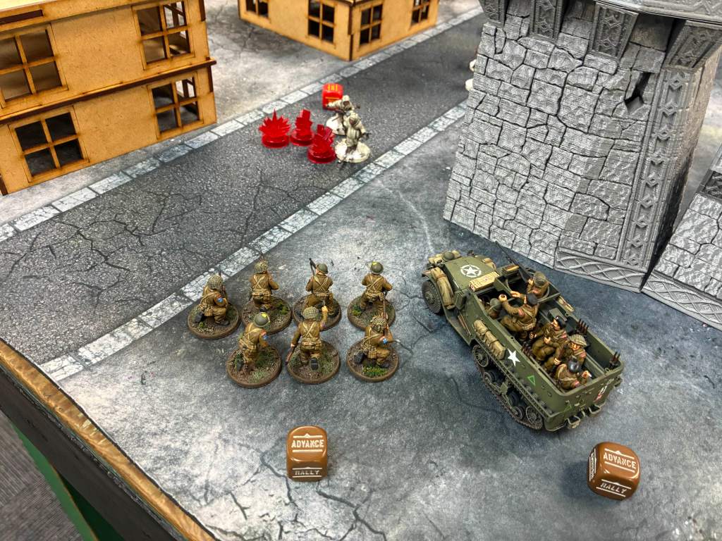 Started with a pin…turn one given order, failed, and backed into cover. Turn 2, given order, passes, and moves forward to shoot at Achilles. Hit, penetrates, but just sets it on fire and immobilzed it. Turn 3 fire again, destroy Achilles. Turn 4, move, fire at half track, miss. Turn 5, again fire at half track, hit, destroy it, MG fires and kills a few infantry. Turn 6, fires HE on light mortar in ruins, hits, kills them. Not a bad days work for an old man…. – Terry