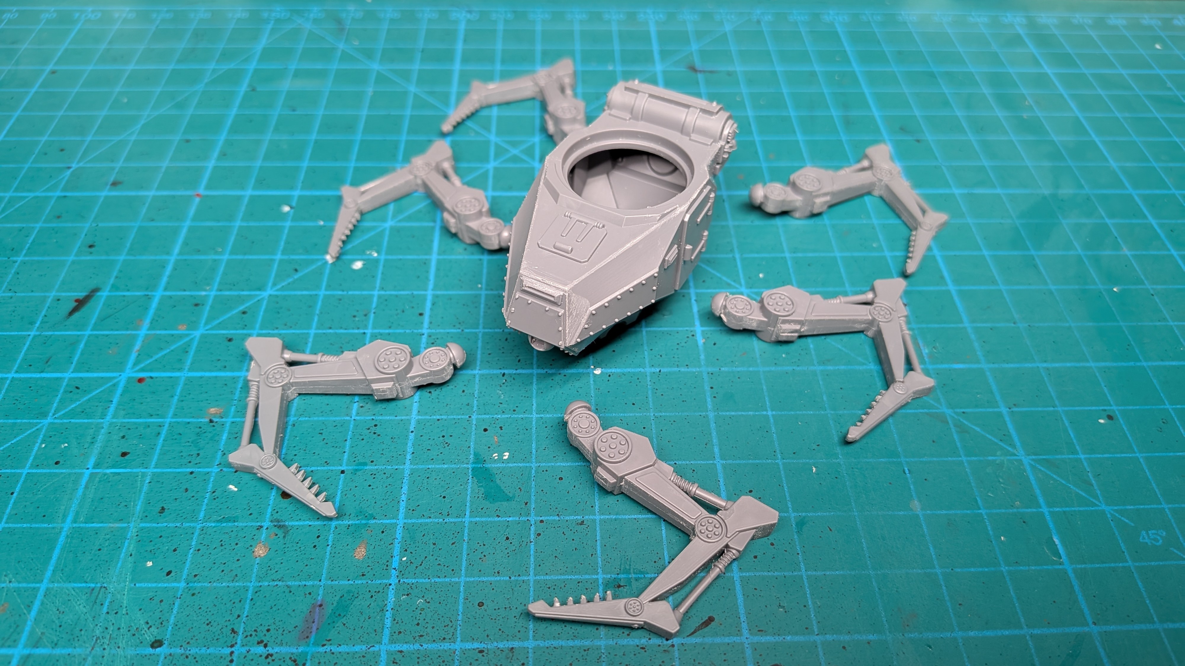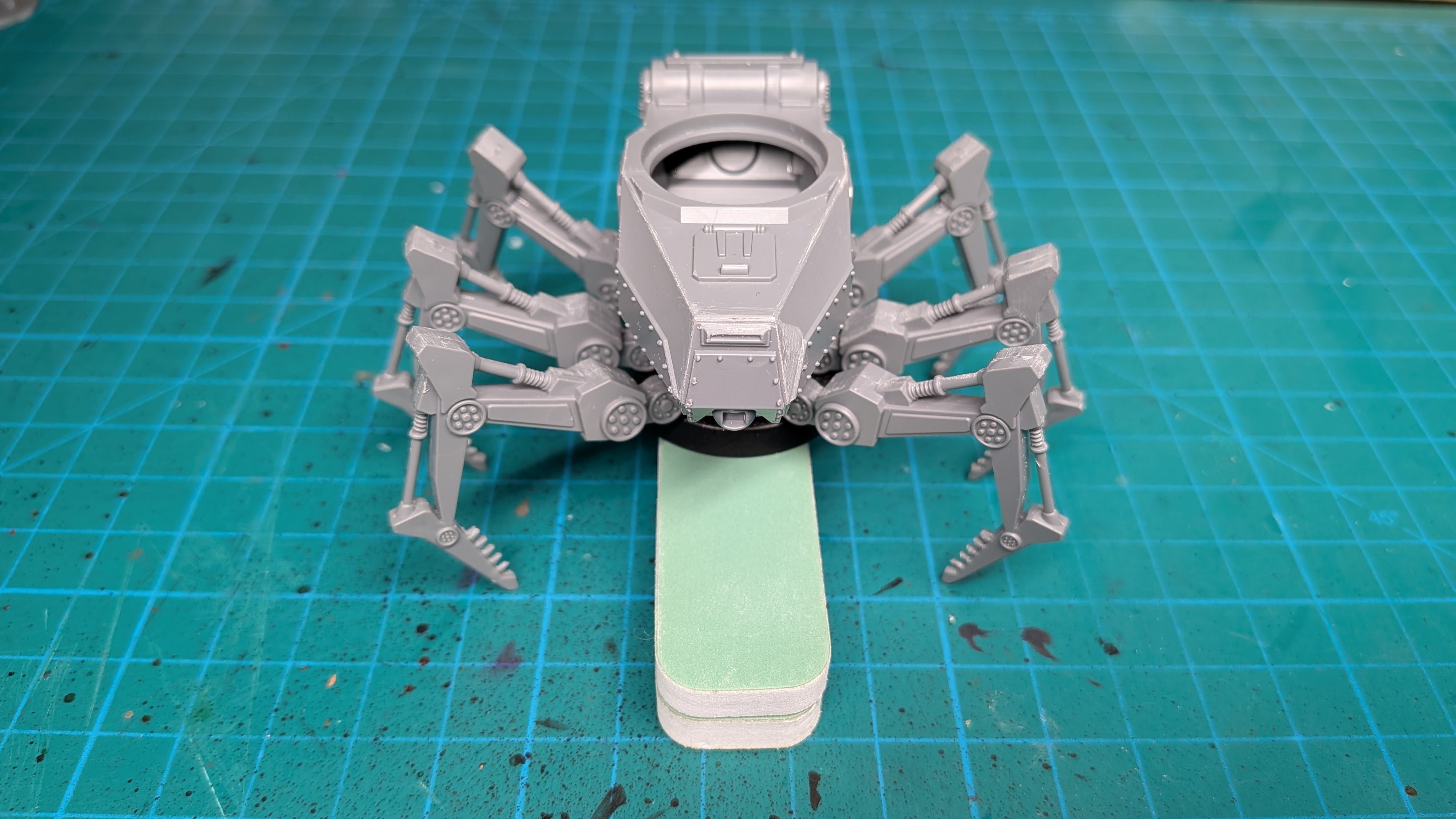 To add the legs to the hull I flipped the model upside down, put some glue into each of the joins, held each leg on for about five seconds and then flipped the model back over. I put some supports under the hull to hold it in place, making sure all of the feet were touching the ground, and left it there for about an hour. It wasn’t a very smooth or pretty process, but I must say, it already looks great. Although I attached the legs in standard way, each one is on a ball joint and you could go wild with the posing. It wouldn’t be too much trouble to have your Vogelspinne climbing up and over some battlefield debris.
