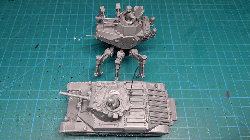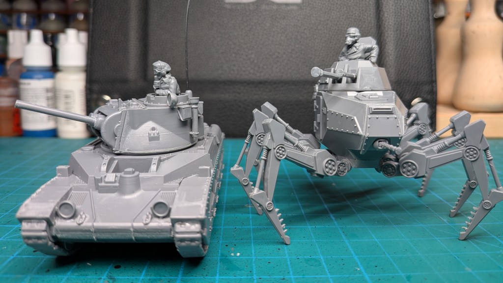 The Vogelspinne is big. Not big as in bulky, but big as in it takes up a lot of real estate. It’s wide and tall, especially if you use Turret A with the Commander. The Warlord Games Matilda II (shown above for scale) is a fairly tall tank and the Vogelspinne towers above it. The Matilda II may be a tad longer, but Vogelspinne is much, much wider. The look of the six legs all splayed out is what gives this walker that Weird War / Dieselpunk aesthetic that you want but man, I don’t see this thing easily getting into any tight spaces! This is not a complaint. I love it. It’s both practical (as in, it looks like it would function) and silly (it’s a tank with spider legs) at the same time. Perfect for K47.