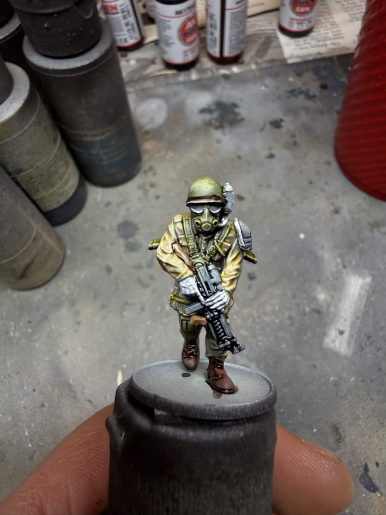 I ran out of basing materials while wrapping up my Axis force. Below is picture of the Axis mini with the basing style I plan to use for my US force.