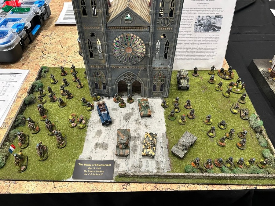 Game 3 was another inter-club match! This time against Joe & Jackson’s French. Their Battle of Montcornet-themed force (with another impressive display board) was a glorious sight on the table with multiple Tanks, Armored Cars, half-tracks, Cavalry, and infantry squads of all flavors and styles, all rallied under the French flag.