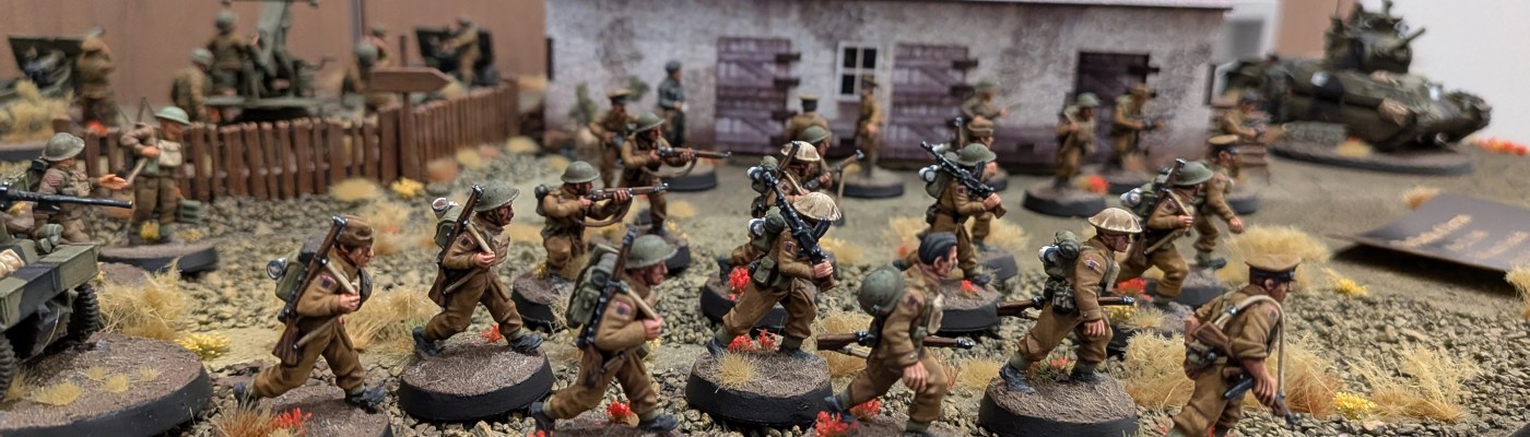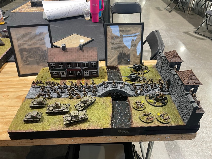 This year, we based our Doubles force on the British Expeditionary Force at the Battle of Arras in May 1940. This was a part of the wider French campaign and was a direct precursor to the evacuation at Dunkirk. Our display captures the British 50th Infantry Division and 1st Army Tank Brigade of the BEF in mid-march on their way to battle. The stoic Tommies go forth in column on the road to Arras while the three Matilda II undergo maintenance. The light artillery has already begun shelling German positions in the distance, and the Bofors are in position to protect against any Luftwaffe incursions. The Commander of the 1st Army Tank Brigade can be seen waving to his troops as they march past, while the officers gather outside an abandoned barn to further discuss the plan of attack.