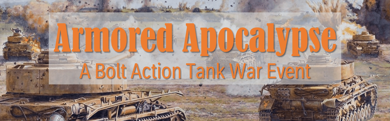 Armored Apocalypse is a three-game, 1500pt. Tank War tournament. Forces must be a single 1,500pt Platoon with a maximum of 12 Order Dice picked from the list of Approved Theater Selectors.