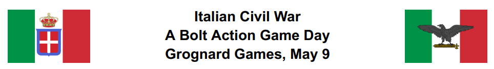 This event will track the confused and spiteful battles among Italian forces immediately following the Italian Armistice of 1943. Partisans, the Regular Army, and Black shirt Militias all sought to control the government. The fighting was as bitter as it was chaotic.